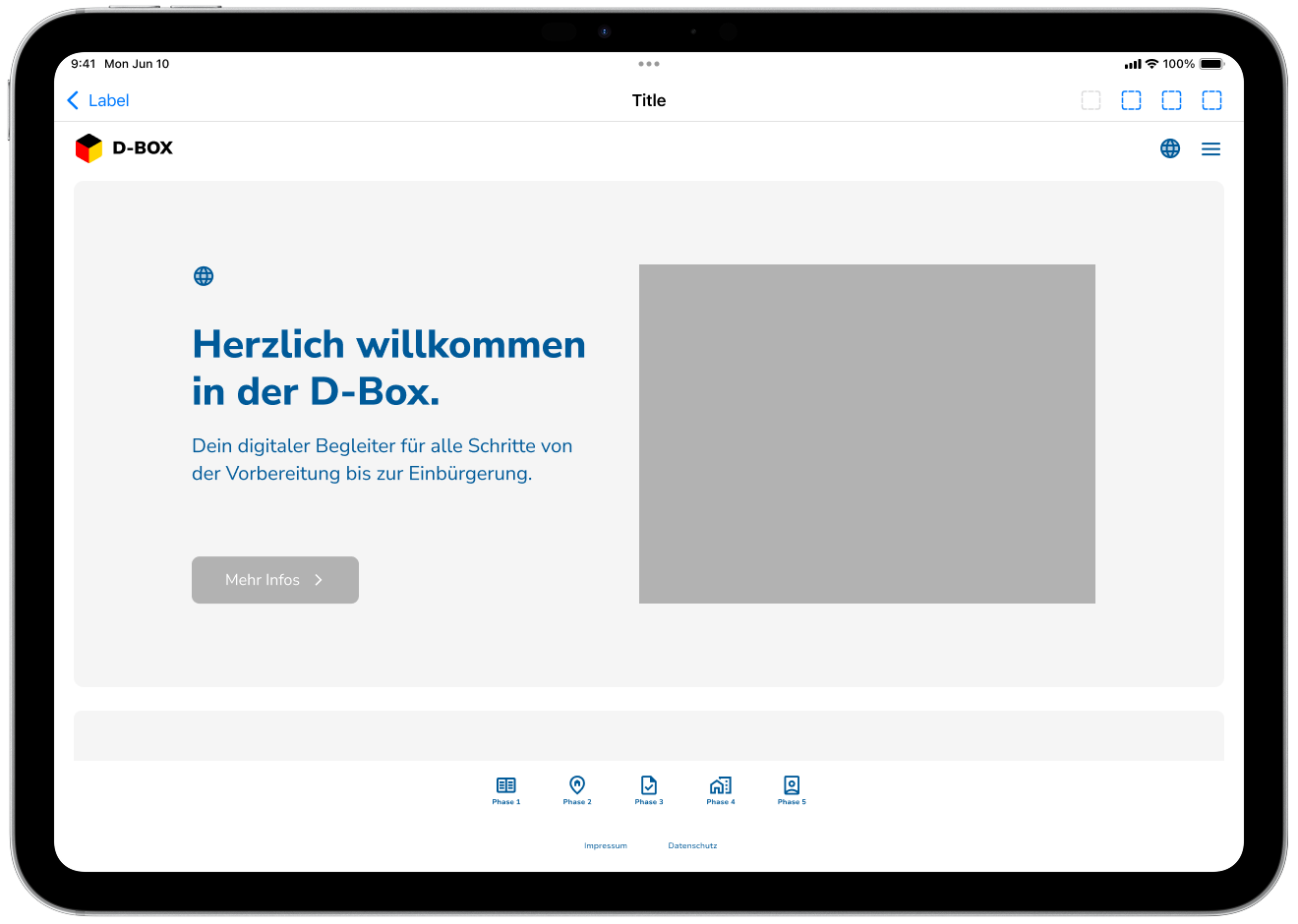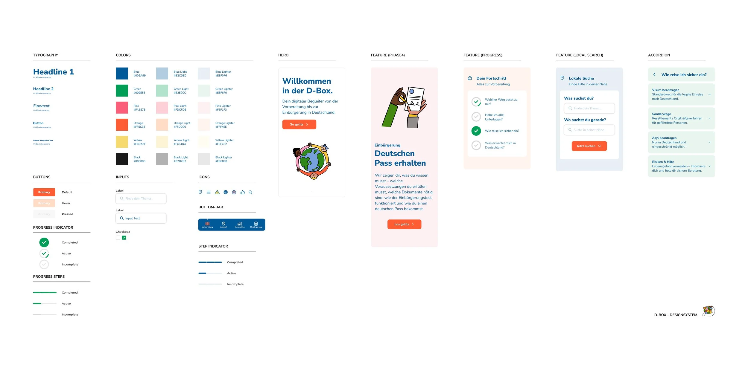 Damit Menschen wie Alieu wirklich von der Website profitieren, habe ich sie nach klaren Designprinzipien gestaltet: Die Website ist zugänglich, einfach, vertrauenswürdig, mobil nutzbar und barrierefrei. Die D-Box begleitet Nutzer Schritt für Schritt durch alle Phasen – von der Vorbereitung bis zur Einbürgerung – vollständig mehrsprachig, realistisch, verständlich und ohne App-Zwang. Durch diese begleitende Struktur können Nutzer selbstwirksam durch den Prozess gehen, während einfache Sprache zusätzlich das Verständnis unterstützt und Sicherheit, Orientierung und Zuversicht vermittelt.